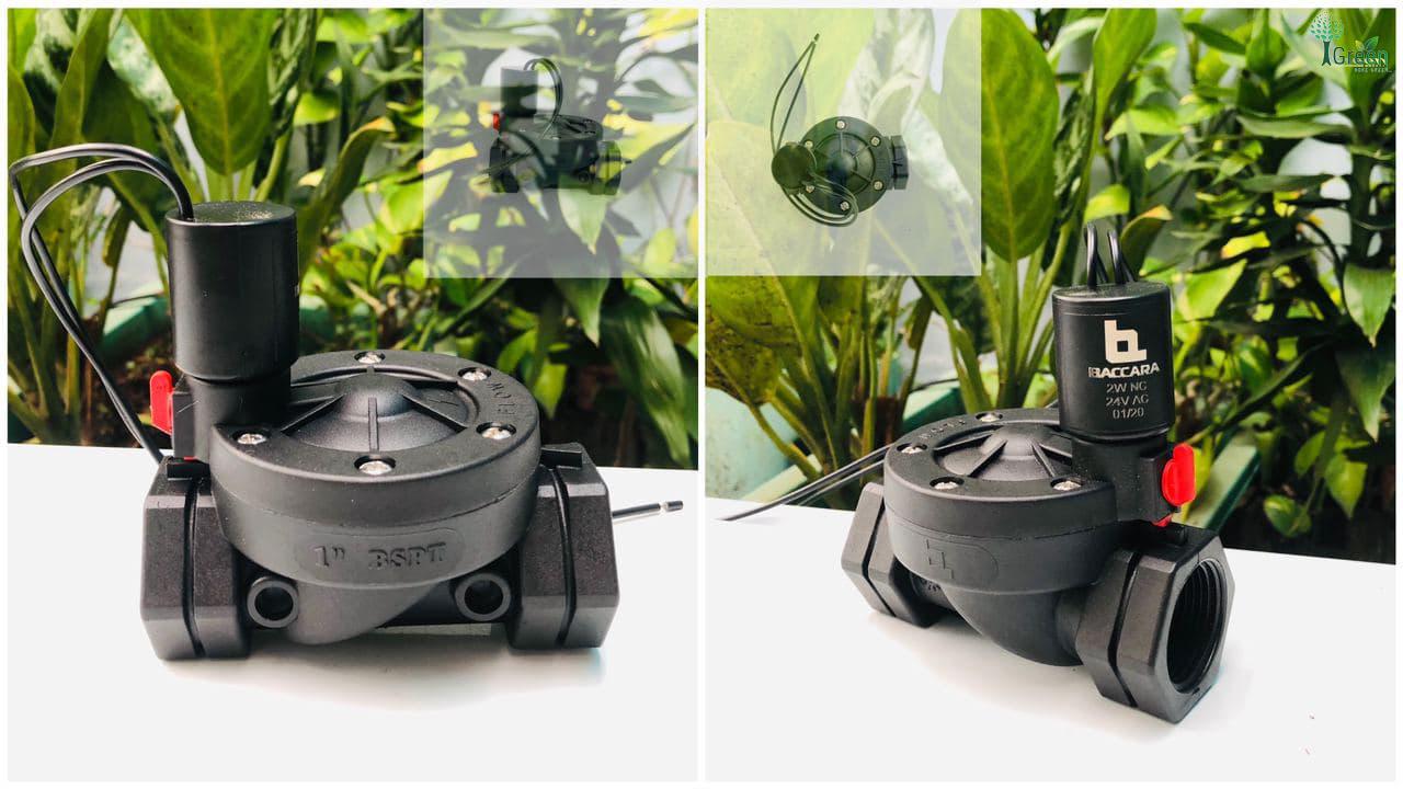 Bộ van điện từ G75 của Baccara – Israel chuyên dùng điều khiển tưới tự động. Van 1” (34mm) có thể tháo rời bên ngoài, giúp dễ dàng bảo dưỡng ngoài ra có van tay giúp xả nước dễ dàng khi gặp sự cố với bộ phận Solenoid.